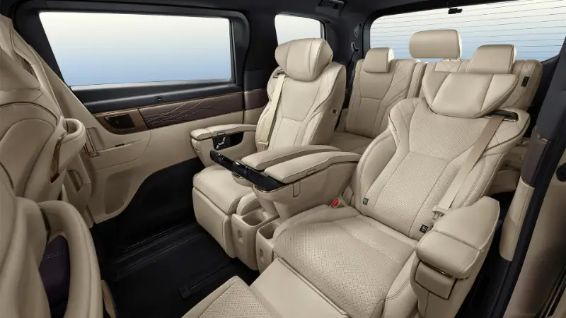 7 мест — два «капитанских» кресла на втором ряду с оттоманками и расширенной эргономикой; максимум комфорта. 8 мест — второй ряд диван, посадочных мест больше, но меньше индивидуальных регулировок. Выбирайте по задачам: комфорт VIP или гибкость посадки.